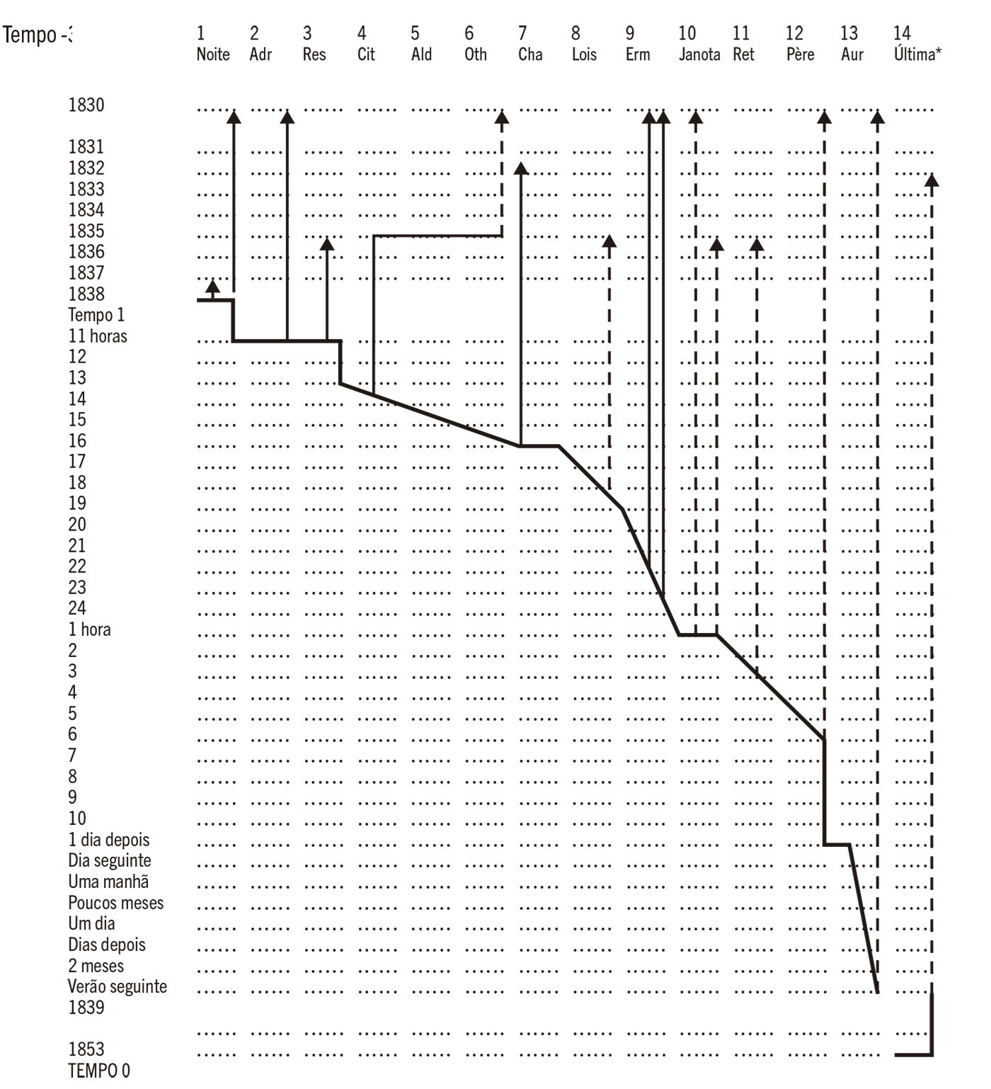 É por esse motivo que eu gostaria que examinassem o diagrama da figura 9. Por favor, não encarem isso como um exercício cruel e desnecessário. O diagrama vai nos ajudar a entender um pouco mais o mistério de Sylvie. No eixo vertical, temos a sequência cronológica implícita dos fatos (a história), que reconstituí mesmo quando Nerval se limita a vagas alusões. No eixo horizontal, temos a sequência dos capítulos — ou seja, o enredo. A sequência da história explícita, sobre a qual Nerval nos informa no texto, aparece como uma linha denteada que acompanha o eixo do enredo; dessa linha partem setas verticais que apontam para o passado. As setas verticais contínuas representam os flashbacks do narrador; as pontilhadas representam os flashbacks (referências, alusões, breves lembranças) que o narrador atribui a Sylvie ou a outras personagens (entre as quais ele mesmo, ao descrever suas recordações para Aurélie). Deveriam iniciar-se no pretérito perfeito composto virtual em que o narrador está falando e apontar para um pretérito mais-que-perfeito composto virtual. No entanto, o uso do imperfeito constantemente mascara esses dois tempos.