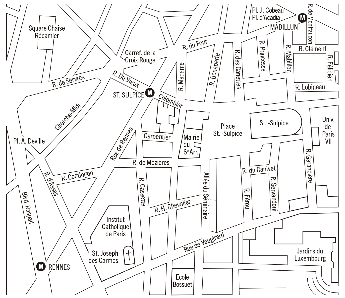 Se lermos o texto de Dumas examinando um mapa do século xviii, veremos que D’Artagnan desce a Rue du Cherche-Midi (que naquela época, observa Dumas, chamava-se Chasse-Midi), passa por uma ruazinha que fica onde está hoje a Rue d’Assas e que sem dúvida era a Rue des Carmes, e dobra à esquerda, “porque a casa de Aramis se situava entre a Rue Cassette e a Rue Servandoni”. Ao sair da Rue des Carmes, D’Artagnan provavelmente corta caminho por um terreno próximo ao convento das Carmelitas Descalças, dobra na Rue Cassette, entra na Rue Messiers (atual Mézières) e de algum modo atravessa a Rue Férou (Ferrau, na época), onde Athos mora, porém nem se dá conta disso (claro está que perambula como as pessoas apaixonadas). Se a casa de Aramis se situa entre a Rue Cassette e a Rue Servandoni, sua localização deveria ser na Rue du Canivet (que aparentemente ainda não existia em 1625).3 No entanto deveria situar-se precisamente na esquina da Rue Servandoni (“Rue?” em nosso mapa), porque bem em frente à casa do amigo D’Artagnan vê um vulto deixar a Rue Servandoni (mais adiante descobrimos que se tratava de Mme. Bonacieux).