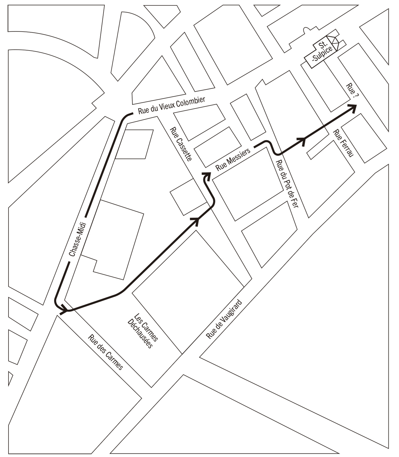 Se lermos o texto de Dumas examinando um mapa do século xviii, veremos que D’Artagnan desce a Rue du Cherche-Midi (que naquela época, observa Dumas, chamava-se Chasse-Midi), passa por uma ruazinha que fica onde está hoje a Rue d’Assas e que sem dúvida era a Rue des Carmes, e dobra à esquerda, “porque a casa de Aramis se situava entre a Rue Cassette e a Rue Servandoni”. Ao sair da Rue des Carmes, D’Artagnan provavelmente corta caminho por um terreno próximo ao convento das Carmelitas Descalças, dobra na Rue Cassette, entra na Rue Messiers (atual Mézières) e de algum modo atravessa a Rue Férou (Ferrau, na época), onde Athos mora, porém nem se dá conta disso (claro está que perambula como as pessoas apaixonadas). Se a casa de Aramis se situa entre a Rue Cassette e a Rue Servandoni, sua localização deveria ser na Rue du Canivet (que aparentemente ainda não existia em 1625).3 No entanto deveria situar-se precisamente na esquina da Rue Servandoni (“Rue?” em nosso mapa), porque bem em frente à casa do amigo D’Artagnan vê um vulto deixar a Rue Servandoni (mais adiante descobrimos que se tratava de Mme. Bonacieux).